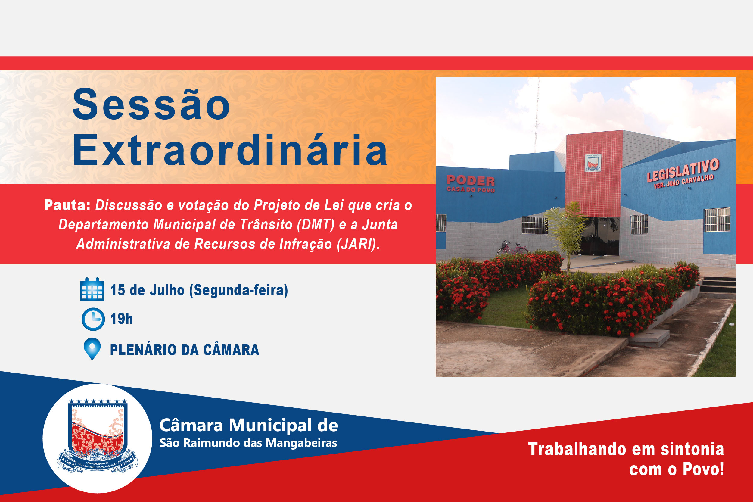 A Câmara de Vereadores de São Raimundo das Mangabeiras realizará nesta segunda-feira, 15 de julho, uma Sessão Extraordinária para discutir e votar o Projeto de Lei n° 04/2019, que Dispõe sobre a criação do Departamento Municipal de Trânsito - DMT, da Junta Administrativa de Recursos de Infração - JARI e dá outras providências.